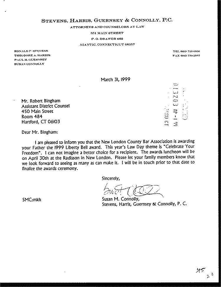 Approximately 60 members of the county bar association and president Barbara Masters, Esq., and a dozen Superior Court judges, including Administrative Judge Susan Handy, were in attendance. The luncheon was organized by Susan Connelly, Esq, Niantic, Chair of the Awards Committee. The Bingham family was represented by David and Annie Bingham, Robert Kim and Anne Bingham, Bill Bingham, Elfie Shaphere and Bill Bailey.